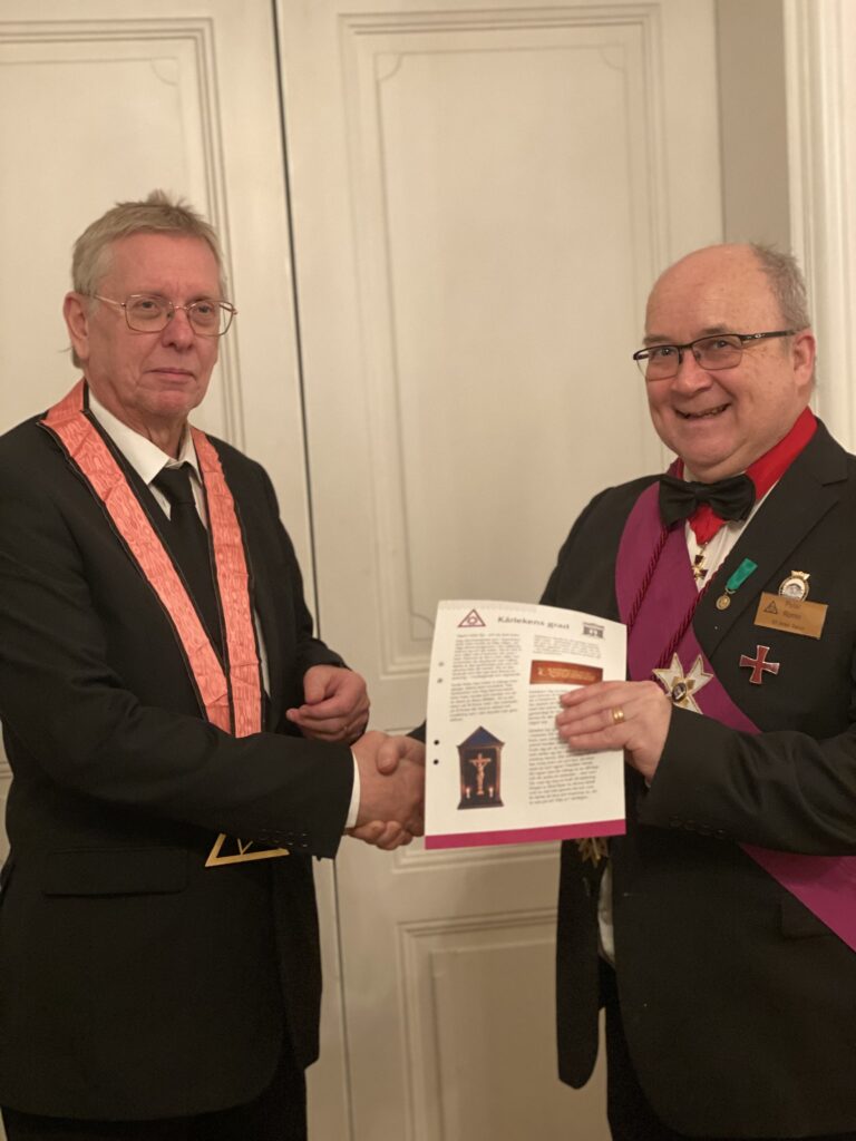Det blev ett innehållsrikt IG möte Torsdag den 22 februari 2024 . Vi startade med att ta del av årsredogörelsen. Vi samlades sedan för ett IG möte. Under mötet delades det ut ”hederstjänstetecken” till vår broder Harald Gabrielsen, som lämnat MR rådet, hederstecknet ”Ordens veteran” till broder Nils-Gunnar Belin efter 25 år som tempelriddare samt den finaste utmärkelsen till broder Björn Edström,som efter 50 år som tempelriddare erhöll hederstecknet som ”Ordenspatriark” . Broder Björn Edström höll sedan ett anförande i anslutning till sin utnämning. Som en festlig avslutning bjöd sedan Broder Björn Edstöm alla närvarande på räksmörgås och en kaka.